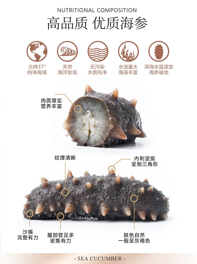 海參屬于無脊椎動物、棘皮動物門、海參綱。我國海參分布在溫帶區(qū)和熱帶區(qū),溫帶區(qū)主要在黃渤海域,主要經(jīng)濟品種是刺參,也是我國最為知名的海參種類,熱帶區(qū)主要在兩廣和海南沿海,主要經(jīng)濟品種有梅花參等。其中西沙群島、南沙群島和海南島是我國熱帶海參的主要產(chǎn)地。海參在各類山珍海味中位尊“八珍”,還具多種中醫(yī)特指的補益養(yǎng)生功能。近半個世紀以來,國內(nèi)外學(xué)者對40多種海參化學(xué)成分的研究表明海參體內(nèi)不但富含氨基酸、維生素和化學(xué)元素等人體所需的50多種營養(yǎng)成分,還含有多種生物活性物質(zhì)如酸性粘多糖、皂苷和膠原蛋白等,而且海參活性物質(zhì)的藥理活性十分廣泛。